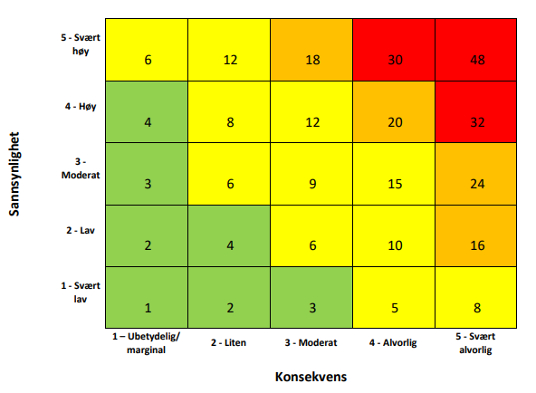 Tallene i risikomatrisen angir scoring. Denne er asymmetrisk, hvor konsekvens vektes høyere enn sannsynlighet.