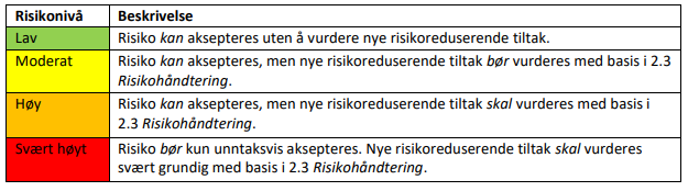 Helse Midt-Norge har utarbeidet en felles risikomatrise som benyttes i hele foretaket. Risikomatrisen ses i figur 2, og beskrivelse av de ulike risikonivå er beskrevet i figur 3.
