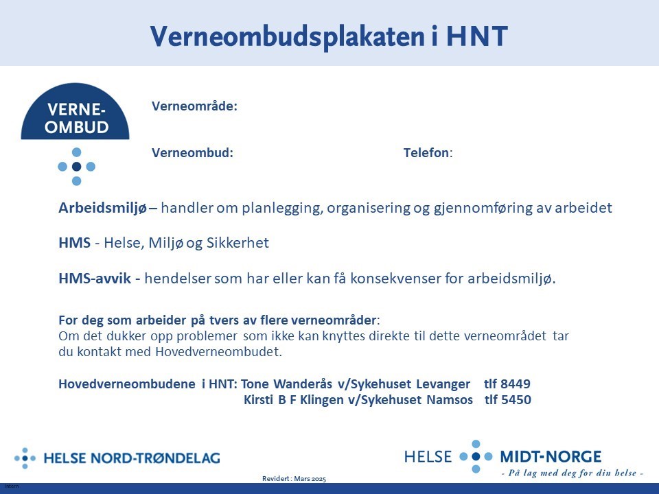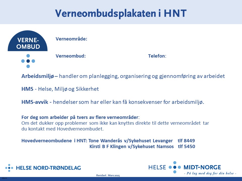 Verneombudsplakat skal inneholde oppdatert informasjon om vernetjenesten og henge godt synlig på sentralt sted på alle seksjoner/avdelinger. (Plakat for utskrift ligger som Relatert).